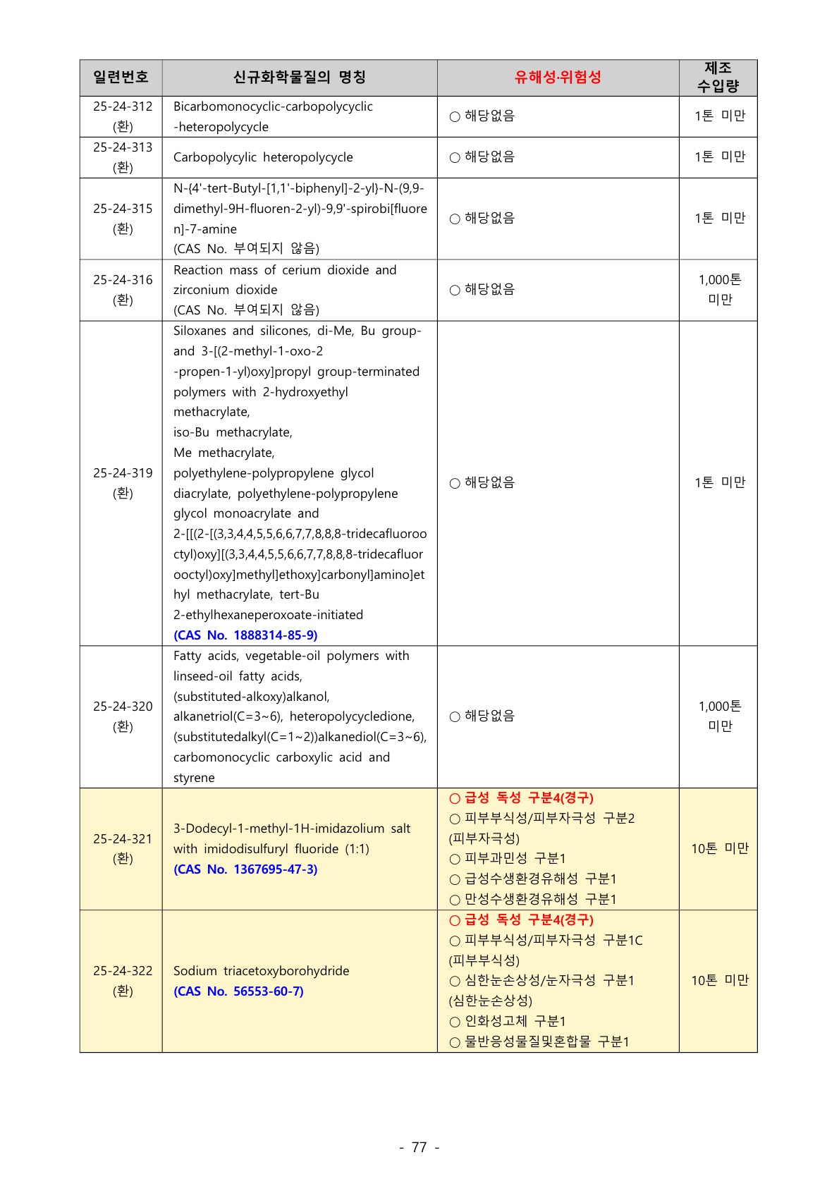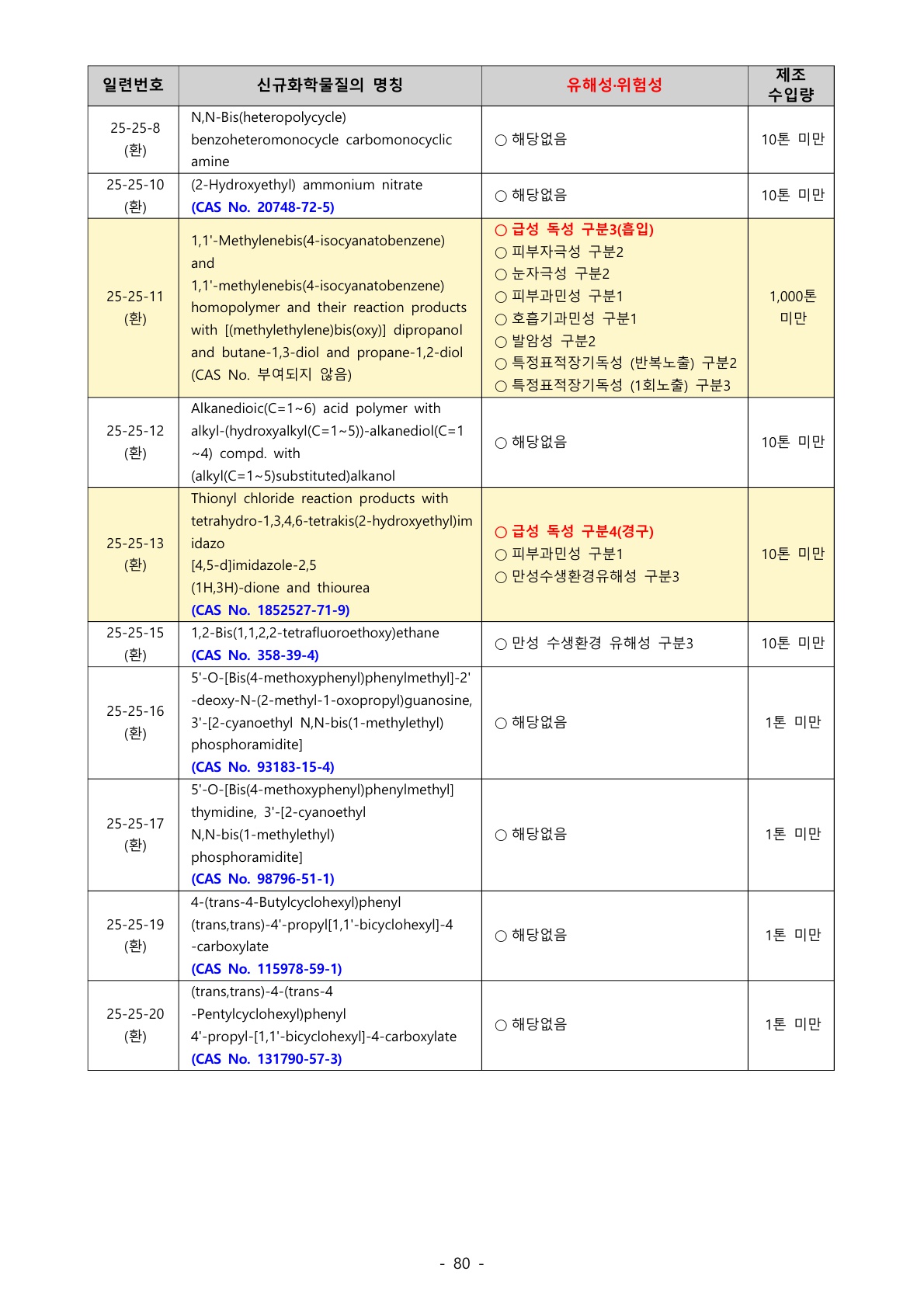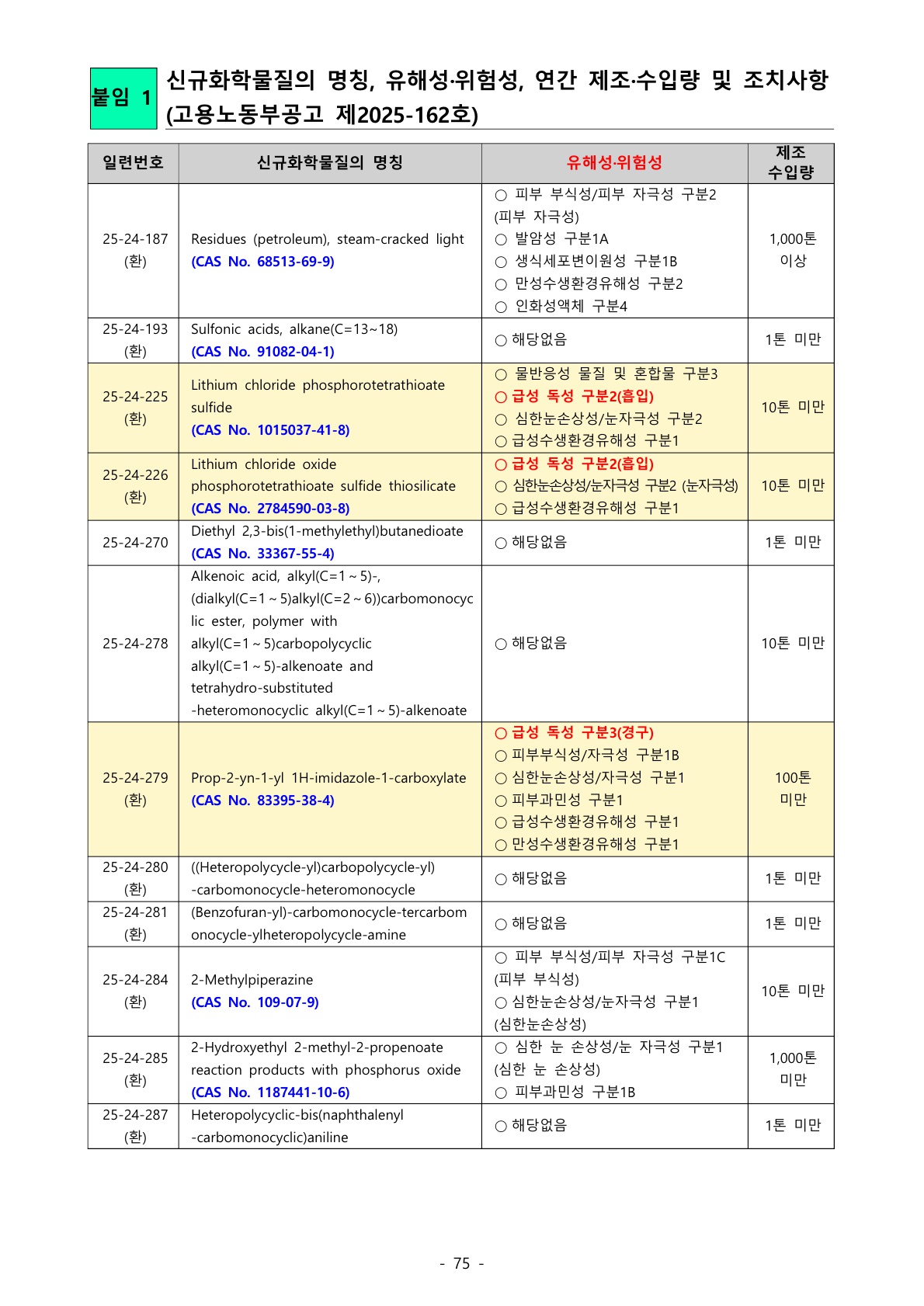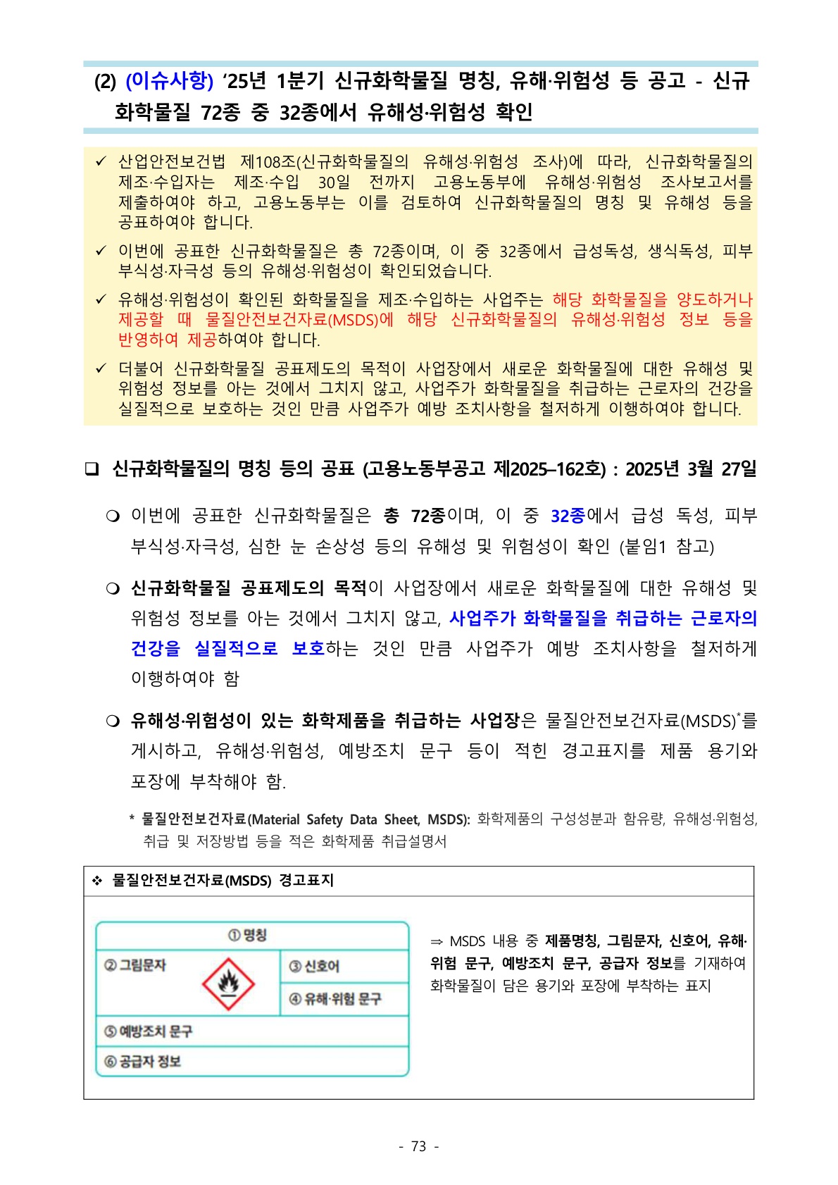 1106_산업안전보건법 (이슈사항) ‘25년 1분기 신규화학물질 명칭, 유해‧위험성 등 공고 - 신규 화학물질 72종 중 32종에서 유해성·위험성 확인