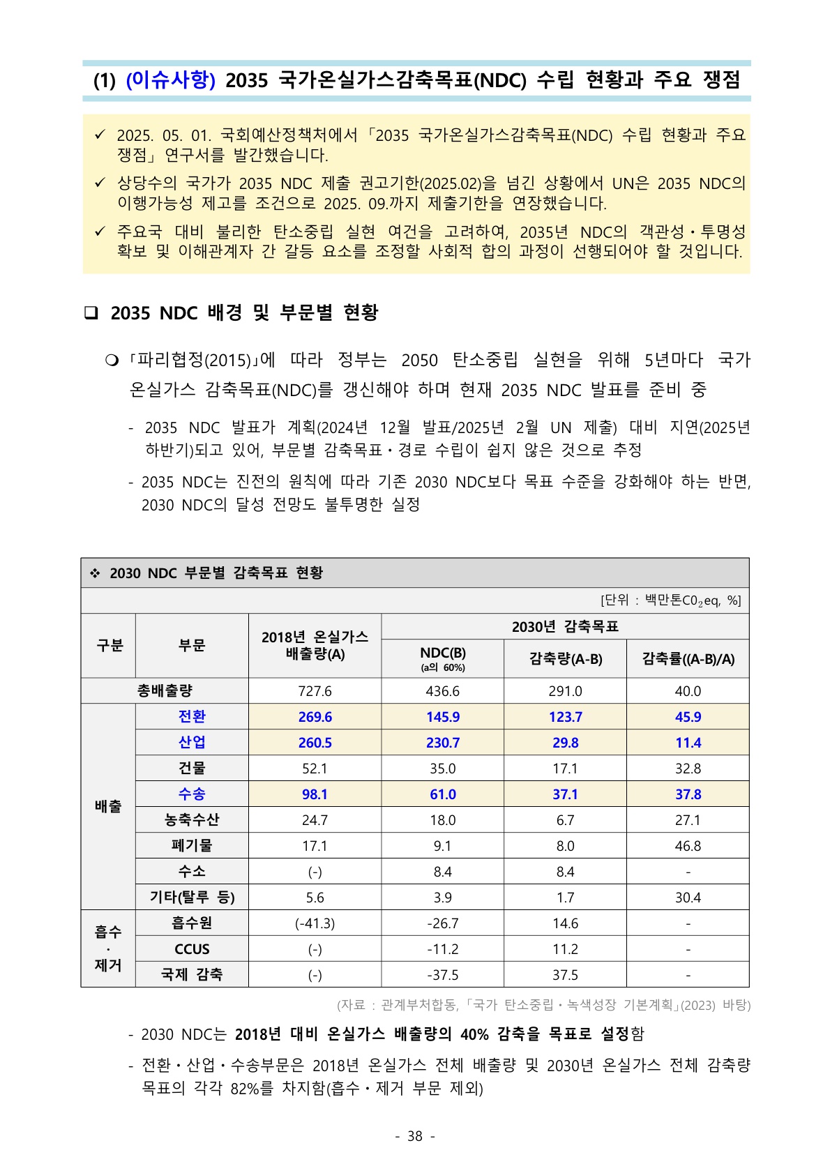 1132_탄소중립기본법 (이슈사항) 2035 국가온실가스감축목표(NDC) 수립 현황과 주요 쟁점 본문