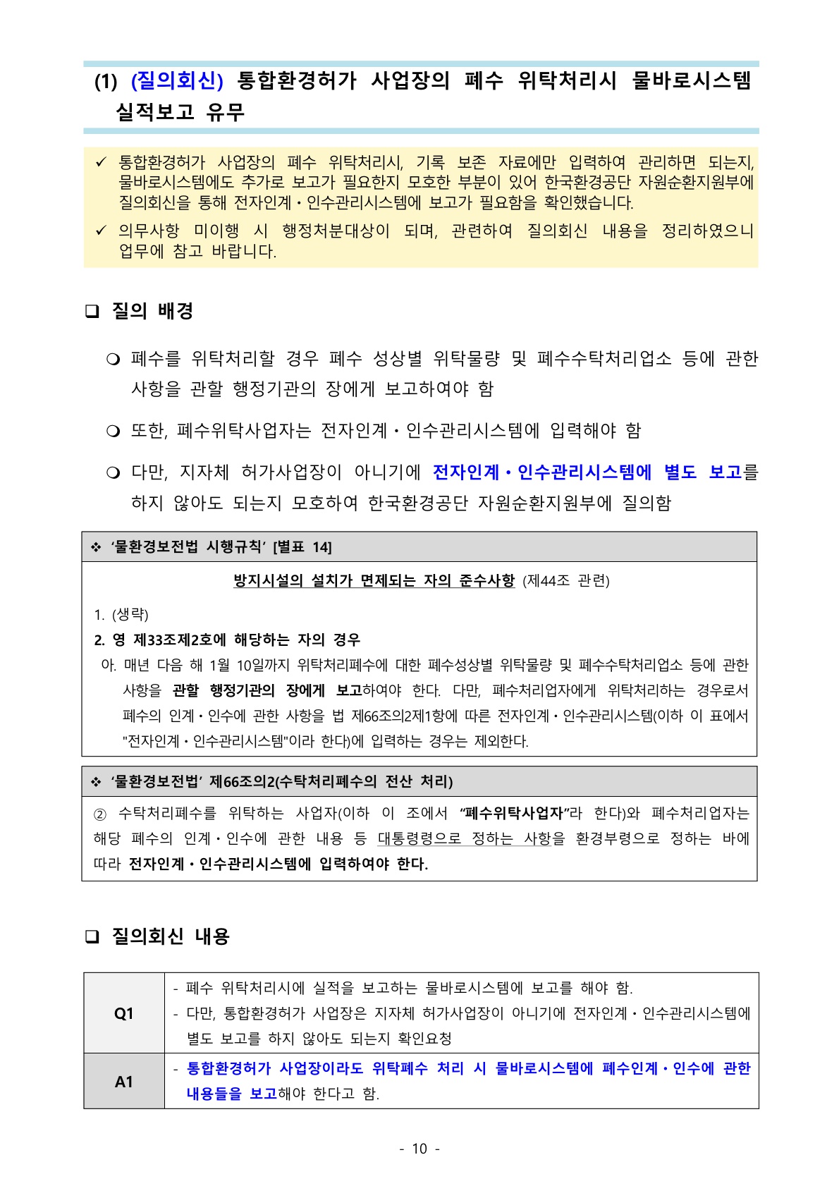 1155_환경오염시설법 (질의회신) 통합환경허가 사업장의 폐수 위탁처리시 물바로시스템 실적보고 유무