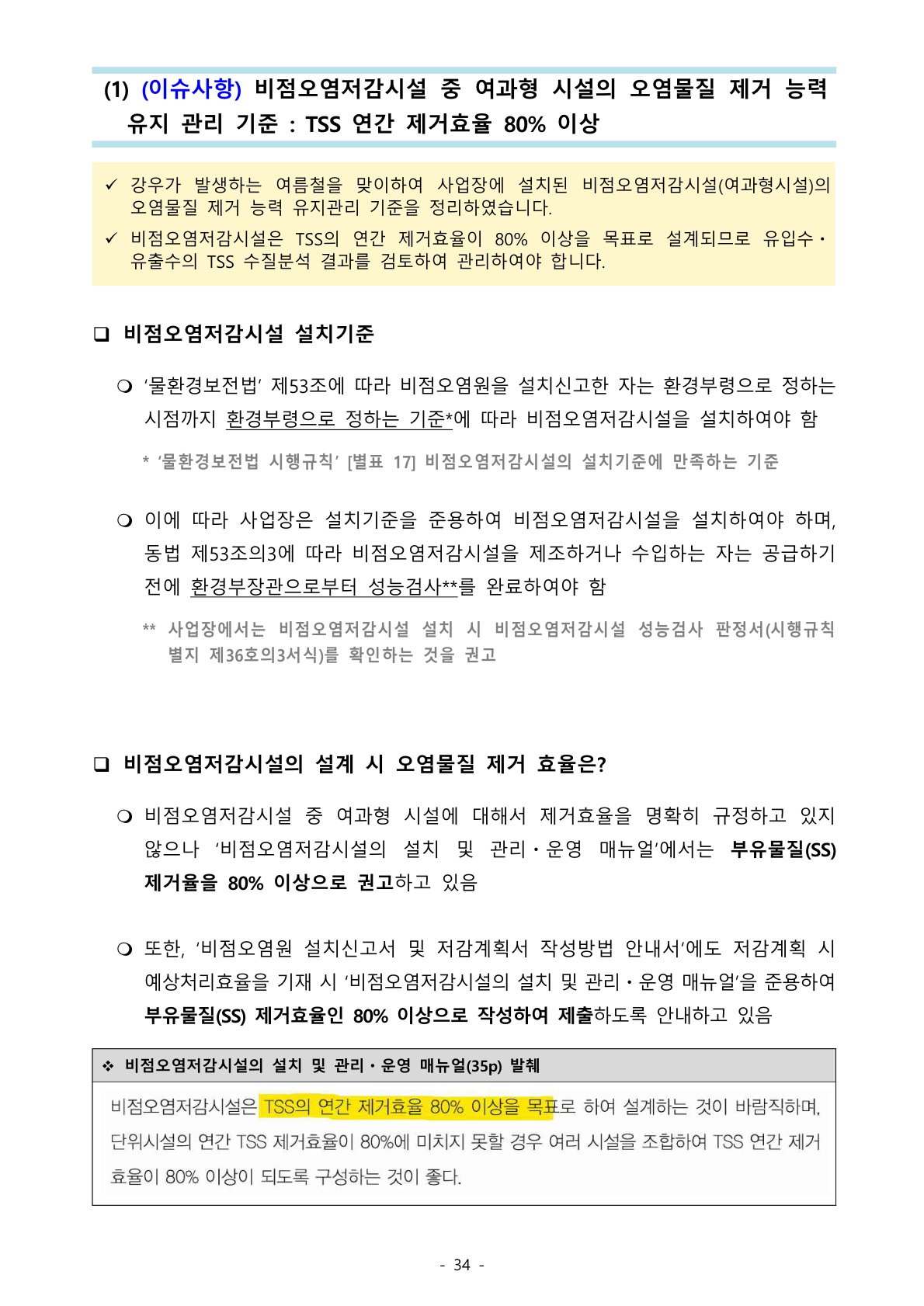 1159_물환경보전법 (이슈사항) 비점오염저감시설 중 여과형 시설의 오염물질 제거 능력 유지 관리 기준 : TSS 연간 제거효율 80% 이상 본문