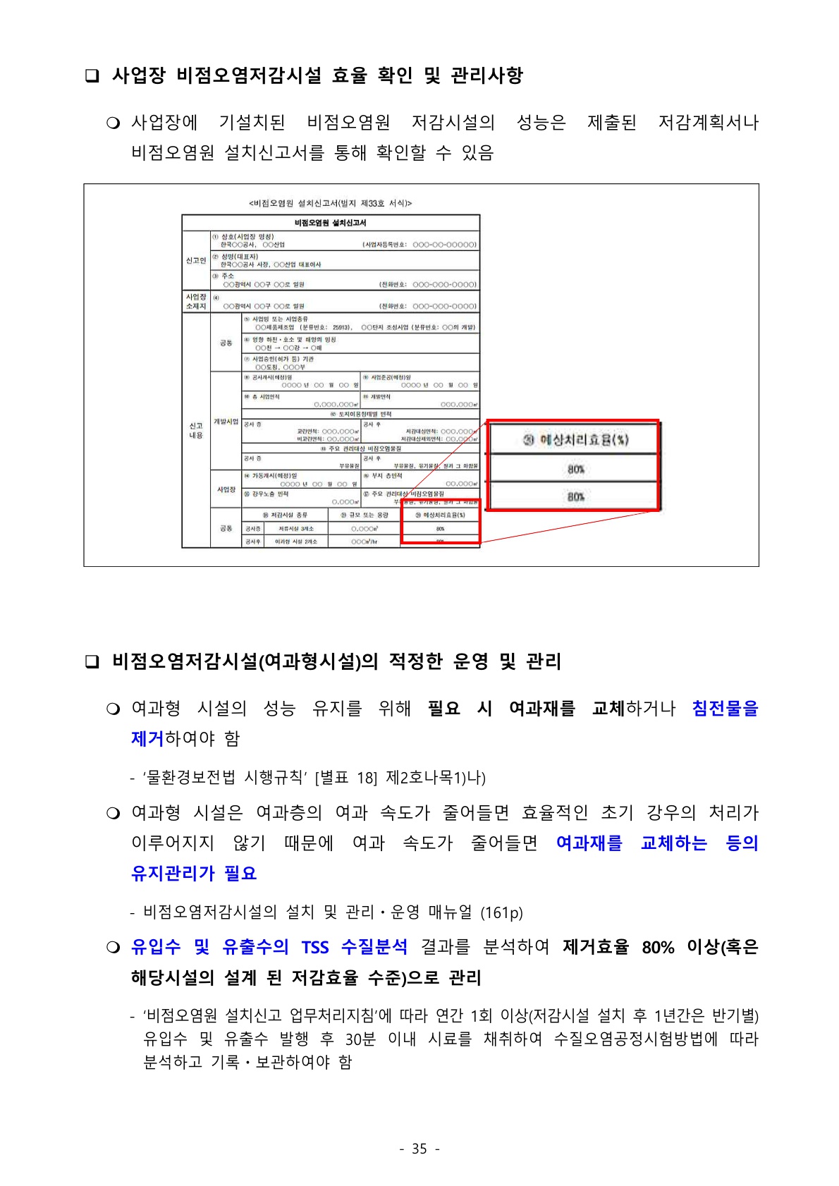 1159_물환경보전법 (이슈사항) 비점오염저감시설 중 여과형 시설의 오염물질 제거 능력 유지 관리 기준 : TSS 연간 제거효율 80% 이상