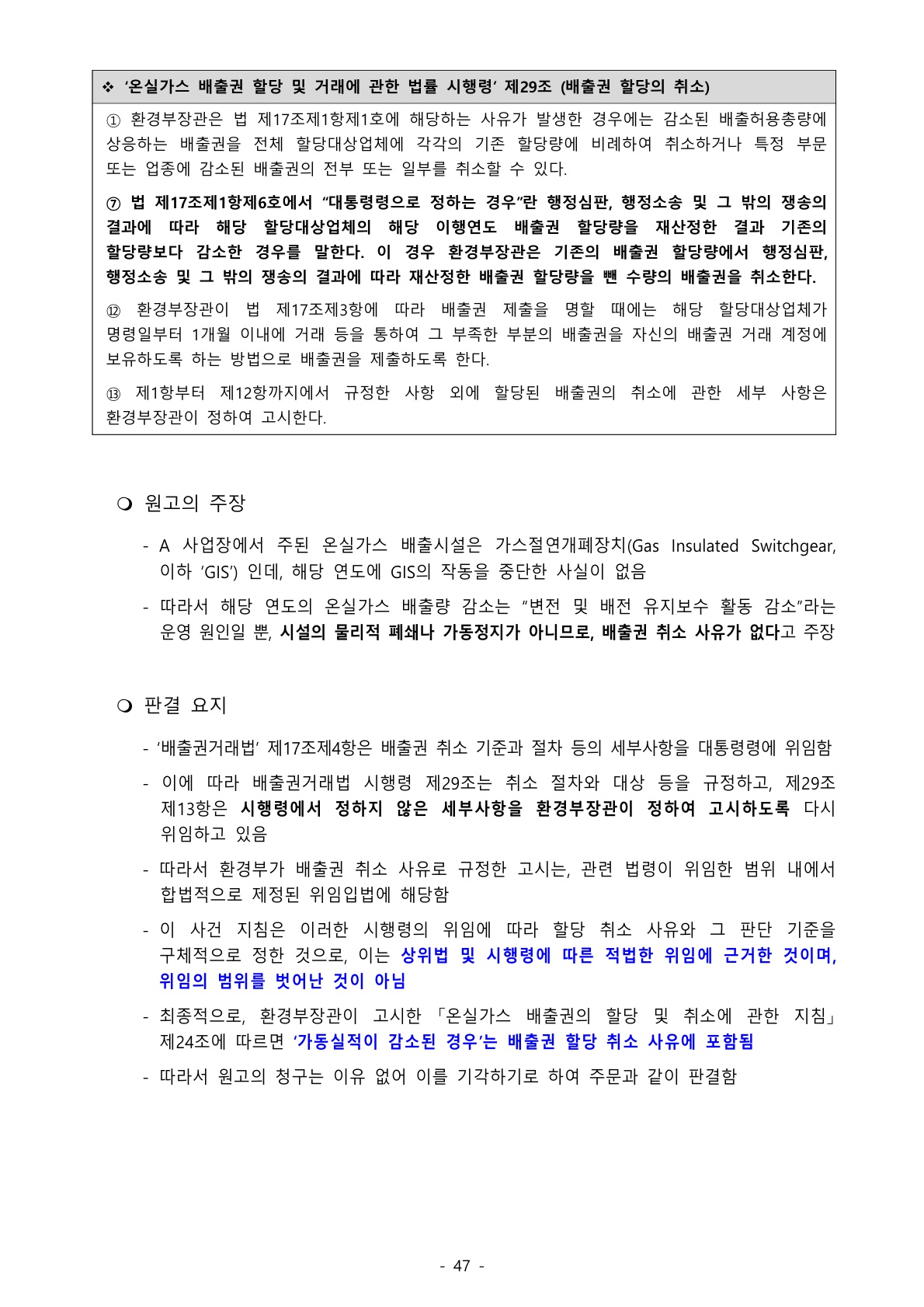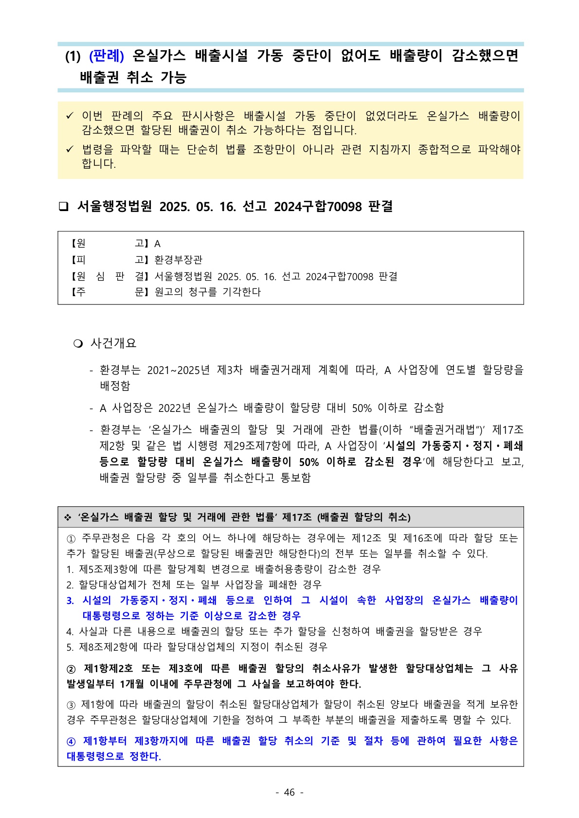 1164_배출권거래법 (판례) 온실가스 배출시설 가동 중단이 없어도 배출량이 감소했으면 배출권 취소 가능 본문