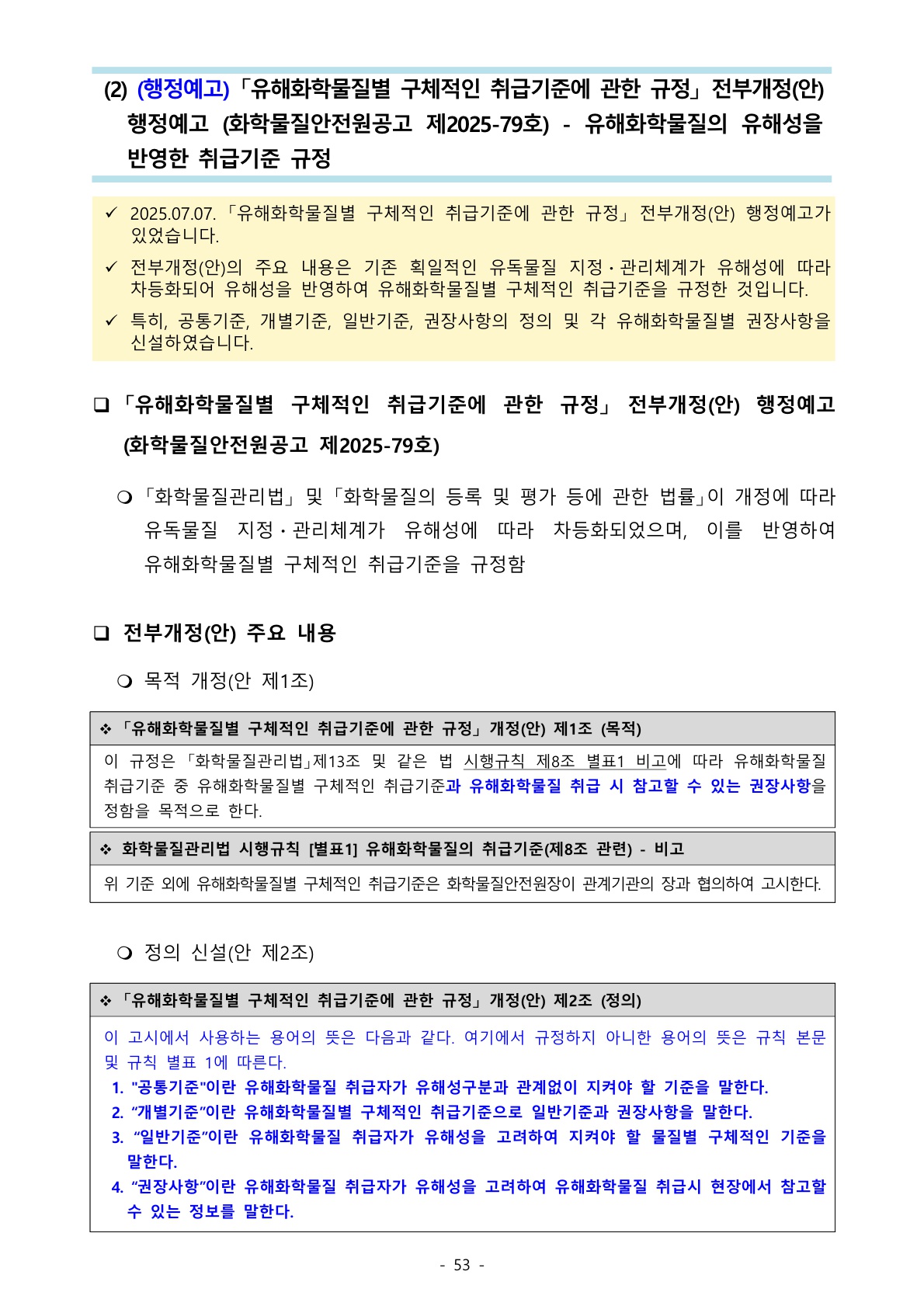 1166_화학물질관리법 (행정예고) 「유해화학물질별 구체적인 취급기준에 관한 규정」 전부개정(안) 행정예고 (화학물질안전원공고 제2025-79호)