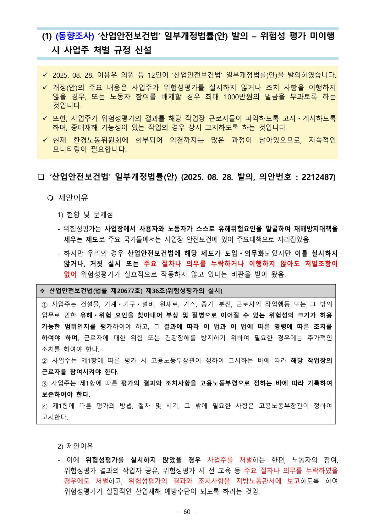 1203_산업안전보건법 (동향조사) '산업안전보건법' 일부개정법률(안) 발의 – 위험성 평가 미이행시 사업주 처벌 규정 신설