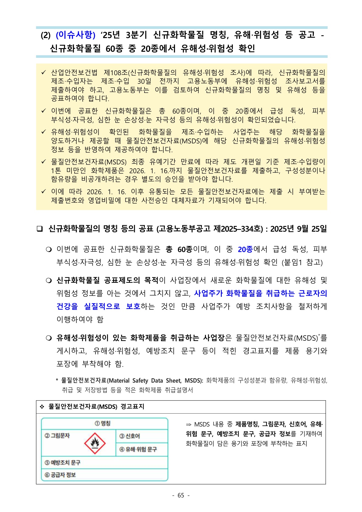 1204_산업안전보건법 (이슈사항) ‘25년 3분기 신규화학물질 명칭, 유해‧위험성 등 공고 - 신규화학물질 60종 중 20종에서 유해성·위험성 확인