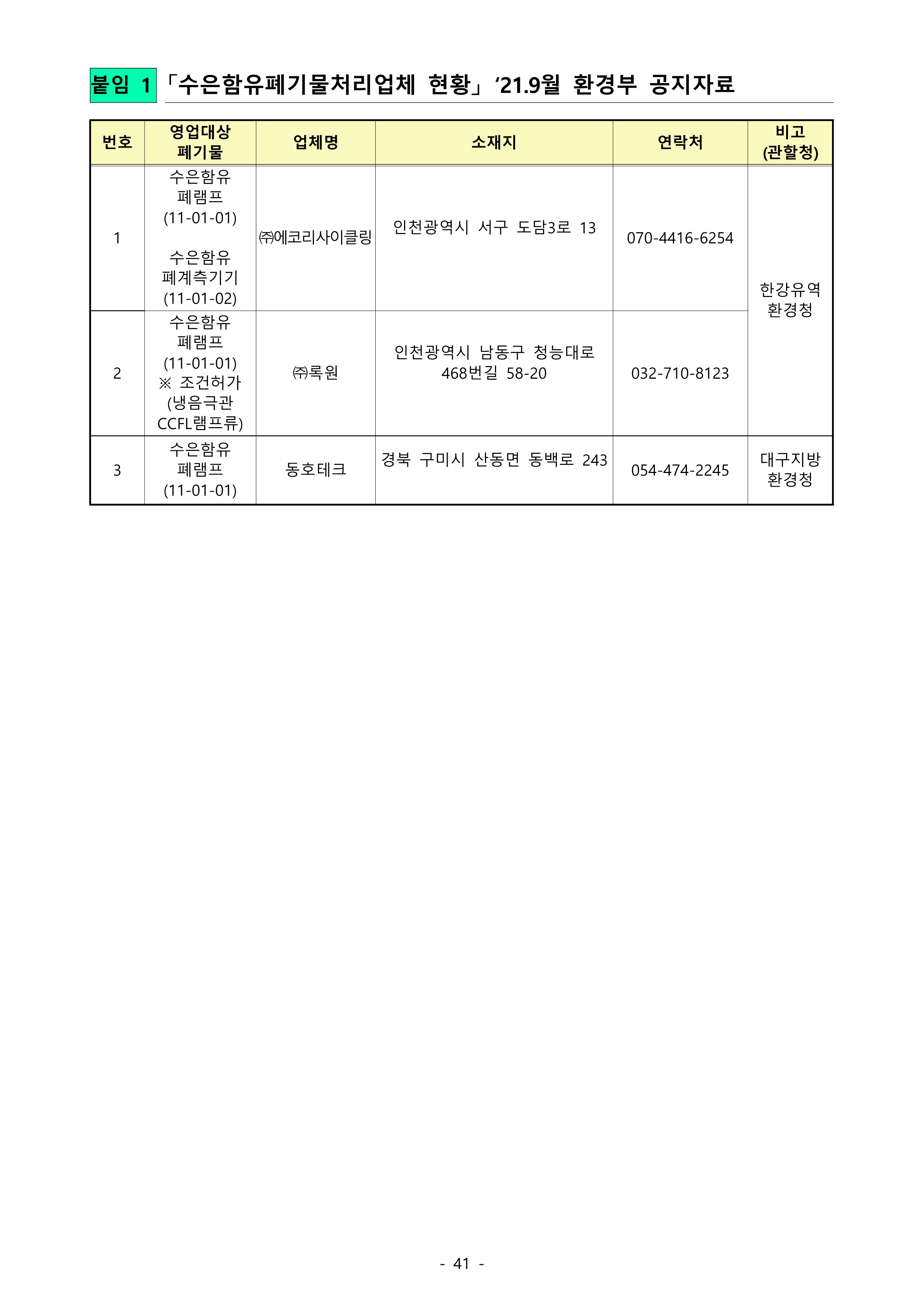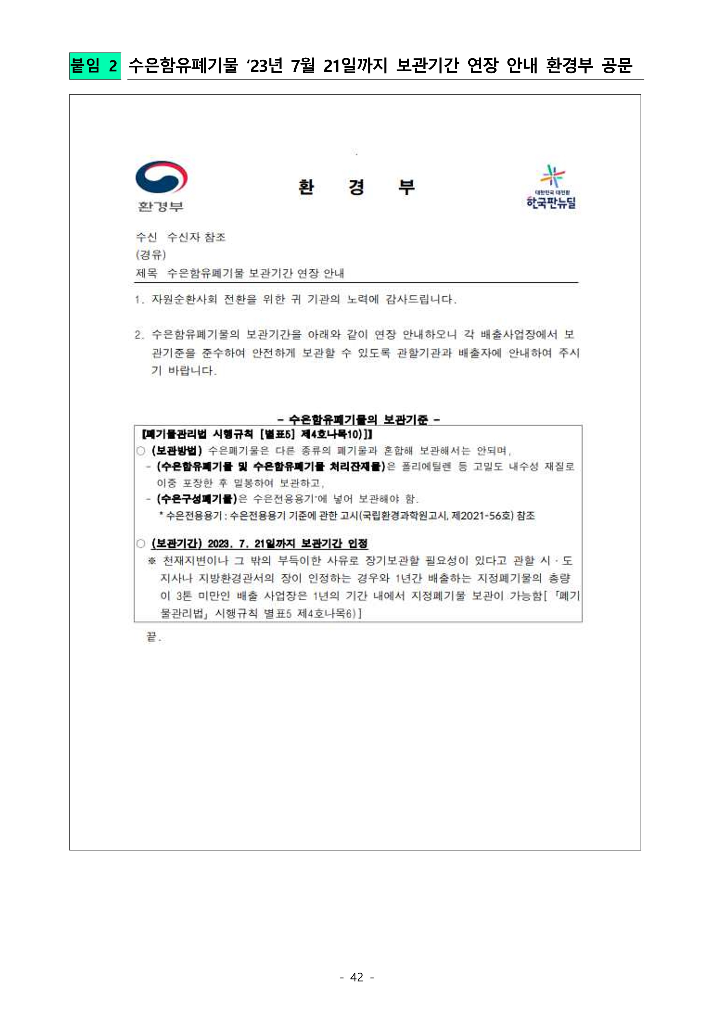 643_폐기물관리법 (이슈사항) 수은함유폐기물 보관기간 '23년 7월 21일까지 연장 안내 본문